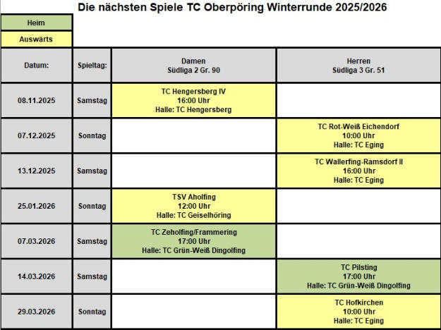 Mannschaften des TC Oberpöring - Sommerrunde 2025 und Winterrunde 2025/2026:Die Übersicht der Mannschaften des TC Oberpöring Sommerrunde 2025 finden Sie hier.Die Übersicht der Mannschaften des TC Oberpöring Winterrunde 2025/2026 finden Sie hier.Siehe hierzu auch die Seiten „Sportliches - Spielbetrieb Jugend“, „Sportliches - Spielbetrieb Erwachsene Sommerrunde“ und „Sportliches - Spielbetrieb Erwachsene - Winterrunde“.Spiele der Mannschaften des TC Oberpöring - Winterrunde 2025/2026:Samstag, 11.10.2025, 17:00 Uhr:TC Oberpöring - TC Straßkirchen 2:4(in der Halle des TC Grün-Weiß Dingolfing)Sonntag, 19.10.2025, 15:00 Uhr:TC Oberpöring - TSG Postmünster 3:3(in der Halle des TC Grün-Weiß Dingolfing)