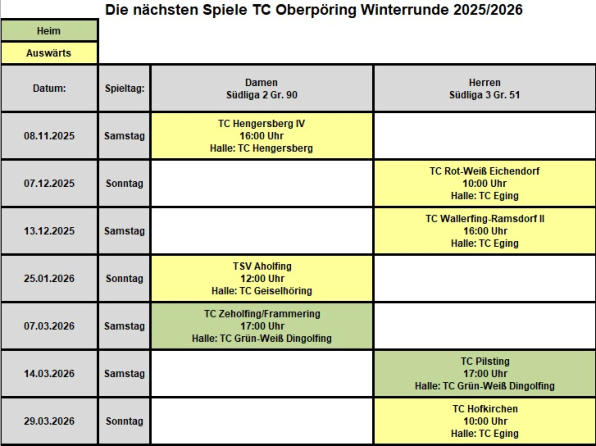 Mannschaften des TC Oberpöring - Sommerrunde 2025 und Winterrunde 2025/2026:Die Übersicht der Mannschaften des TC Oberpöring Sommerrunde 2025 finden Sie hier.Die Übersicht der Mannschaften des TC Oberpöring Winterrunde 2025/2026 finden Sie hier.Siehe hierzu auch die Seiten „Sportliches - Spielbetrieb Jugend“, „Sportliches - Spielbetrieb Erwachsene Sommerrunde“ und „Sportliches - Spielbetrieb Erwachsene - Winterrunde“.Spiele der Mannschaften des TC Oberpöring - Winterrunde 2025/2026:Samstag, 11.10.2025, 17:00 Uhr:Damen: TC Oberpöring - TC Straßkirchen 2:4(in der Halle des TC Grün-Weiß Dingolfing)Sonntag, 19.10.2025, 15:00 Uhr:Herren: TC Oberpöring - TSG Postmünster 3:3(in der Halle des TC Grün-Weiß Dingolfing)Samstag, 08.11.2025, 16:00 Uhr:Damen: TC Hengersberg IV - TC Oberpöring(in der Halle des TC Hengersberg)
